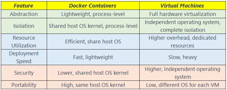 With the help of virtual machines (VMs), the underlying hardware may be completely virtualized, allowing many separate operating systems to coexist on the same physical host. Each virtual machine (VM) is equipped with a unique operating system and set of resources (CPU, memory, storage, etc.). Higher isolation and security are the results, but more setup time and resources are needed.