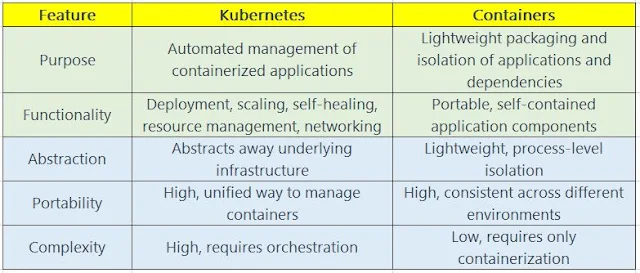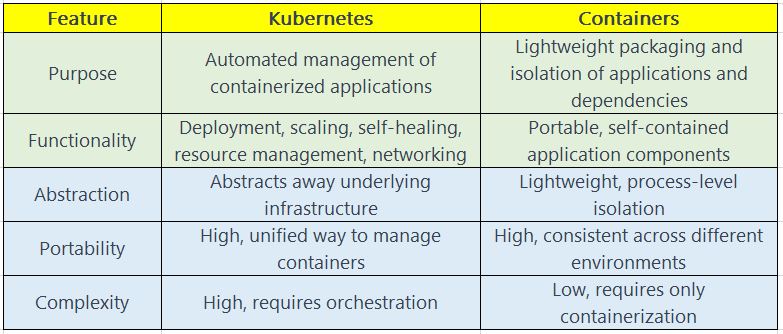 Containers offer a mechanism to bundle and separate containerized apps and their dependencies, while Kubernetes offers a high-level framework for managing them. Containers are portable and self-contained, and Kubernetes offers a single approach to manage them.