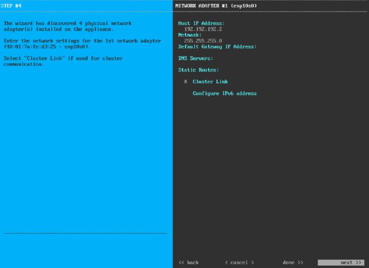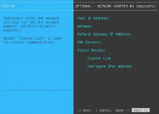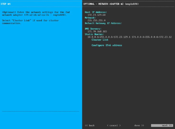 You need to configure the adapters with the IP address and the subnet Masks as shown below. This interface can be used for intra Cluster communications. Connect to access switch with connections to other nodes in the cluster. Also provide a default Gateway and a DNS Server. If needed provide a static route, or leave it blank. Once done Click next.