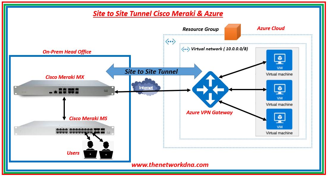 Site-to-Site VPN between Azure and Meraki MX is a VPN connection that allows communication between a network in Microsoft Azure and a network in a Meraki MX security appliance.