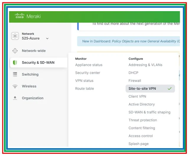 Step 1: Login to the Cisco Meraki portal and check for the S2S-Azure network and select site-to-site VPN as shown below