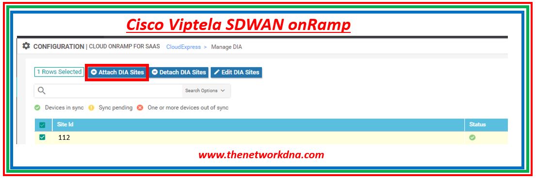 Step 3: Now Attach DIA sites as shown below, When you are attaching devices, there are two options and these are ( Cisco OS - cEdge and Viptela OS - vEdge), Select the device which needs to be added on the DIA sites.