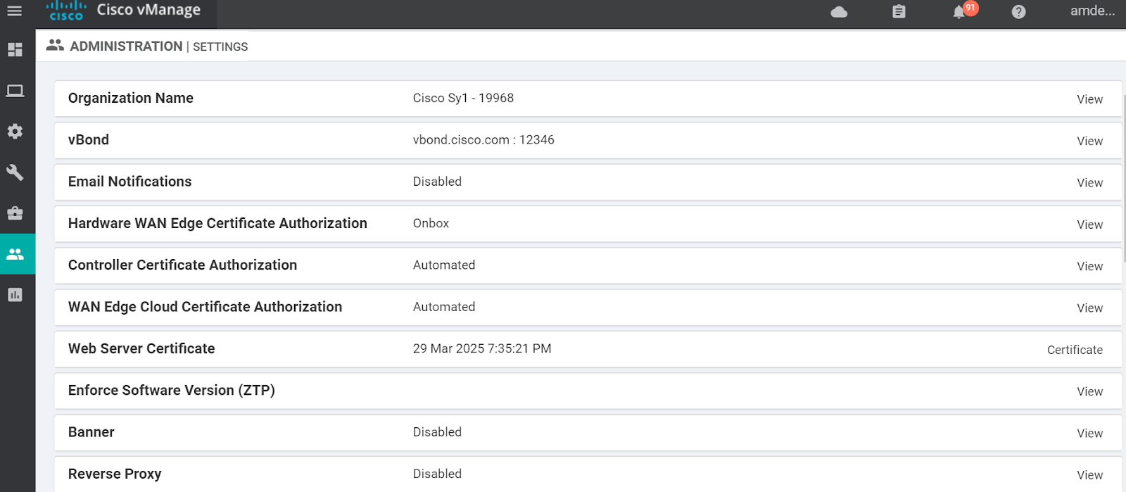 - Access the vManage Settings Page Click Administration Select Settings.