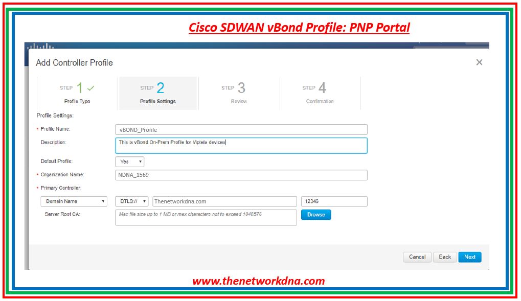 Step 3: Enter the data in “Add Controller Profile” and click “Next”. Enter the organization name used in vManage and the domain/IP address of the vBond controller.