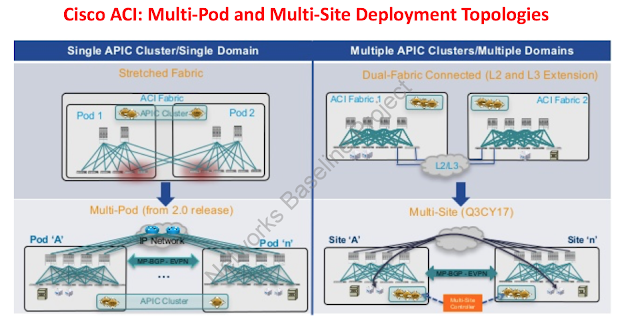 - Redundancy: In Multi-Pod, Redundant nodes, interfaces and devices within a fabric while in Multi-Site, we have adds full site active/active or active/standby deployment with end-to-end policy definition and enforcement.