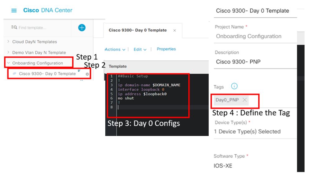 First we need to define the Day 0 Template which is called as onboarding template where we can define the basic configuration. In our example we are putting very basic configurations like domain name, Loopback 0 interface IP address and can be defined more.