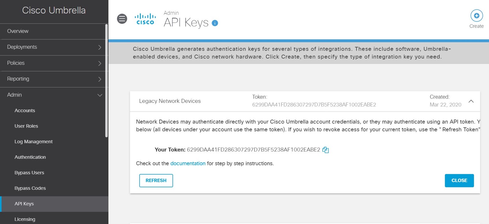 Login to Cisco Umbrella > Admin > API Keys > Generate API Key - one from these four options as described ( Umbrella Network devices | Legacy Network devices | Umbrella reporting | Umbrella Management ).