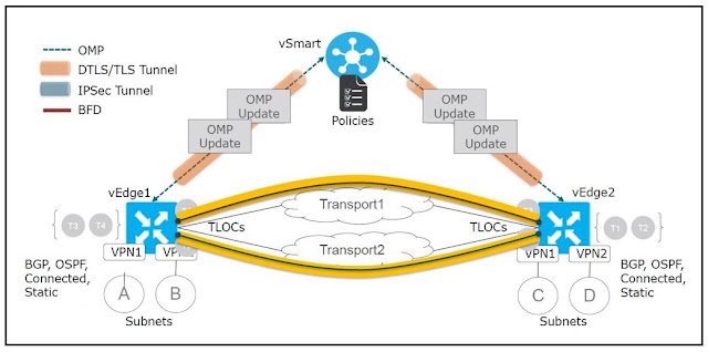 DTLS (Datagram Transport Layer Security protocol) : The vSmart controller, which is the centralized brain of the Viptela solution, establishes and maintains DTLS or TLS connections to all Viptela devices in the overlay network which means to the vEdge routers, the vBond orchestrators, to vManage NMSs, and to other vSmart controllers. These connections carry control plane traffic. DTLS or TLS provides communication privacy between Viptela devices in the network, using the Advanced Encryption Standard (AES-256) encryption algorithm to encrypt all control traffic sent over the connections.