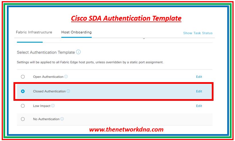 A number of predefined authentication templates are available in Cisco DNA Center to simplify the process of implementing authentication on your network. The fabric edge will be automatically configured once a template is selected.