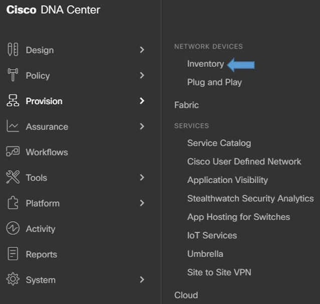Click on Cisco DNA Center --> Provision --> Inventory as shown below in the image.