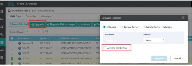 - vManage : a drop-down button and select the latest version. Make sure once you starting the upgrade button, always do upgrade and activate checkbox ticked. if it is not activate you may need to do this step again.