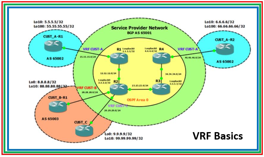 Below if the basic topology showing the VRF defining in the MPLS network only for the reference. The IP address and the topology showing here is just for the demo purposes and has no relevance with any of the enterprise network