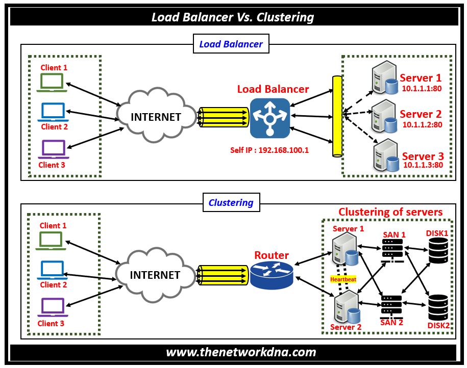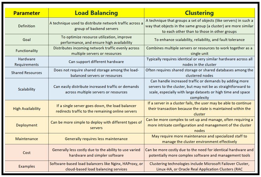 While both strategies strive to increase scalability and availability, they have significant distinctions. Load balancing does not require shared storage among load-balanced servers or resources, but clustering frequently necessitates shared storage or databases among clustered nodes. Load balancing operates at the network or application layer to distribute incoming network traffic evenly across various servers or resources.