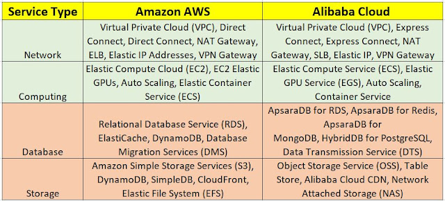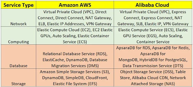 Below are the types of services defined and provided by AWS and Alibaba Cloud as shown in the table