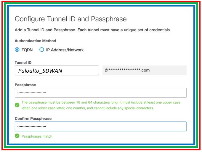 Step 4: Select Fully Qualified Domain Name (FQDN) or IP Address/Network for the Authentication Method. Add the Tunnel ID and create a passphrase.