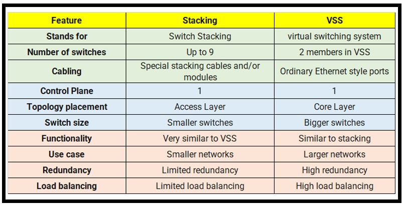 Despite the fact that both technologies (Stacking and VSS) aim to integrate many separated switches into a single management plane, it is essential to understand the ways in which they differ.